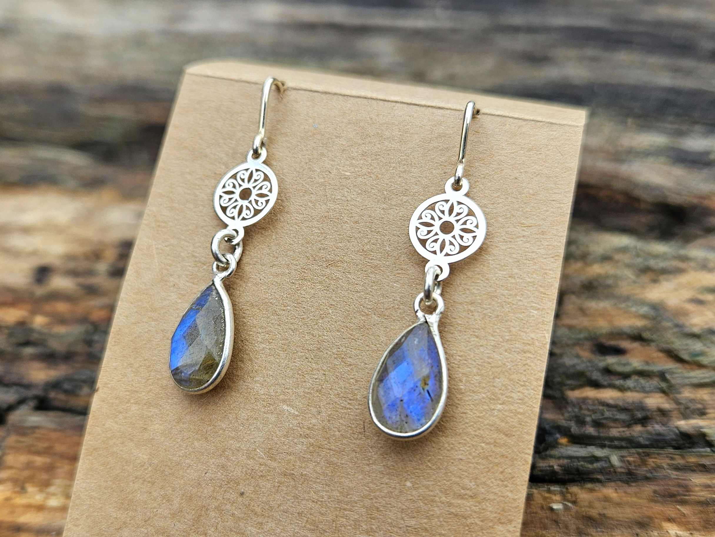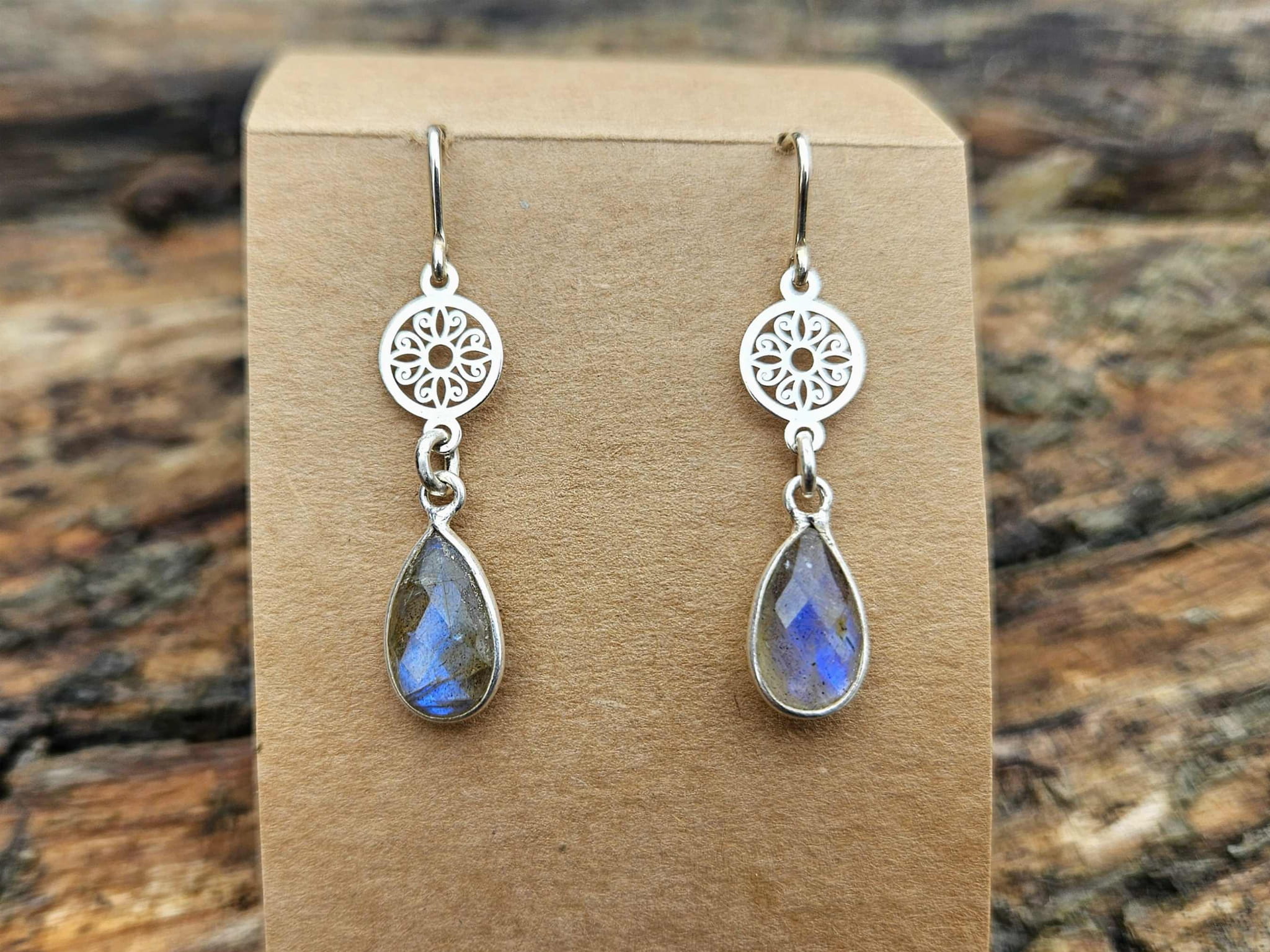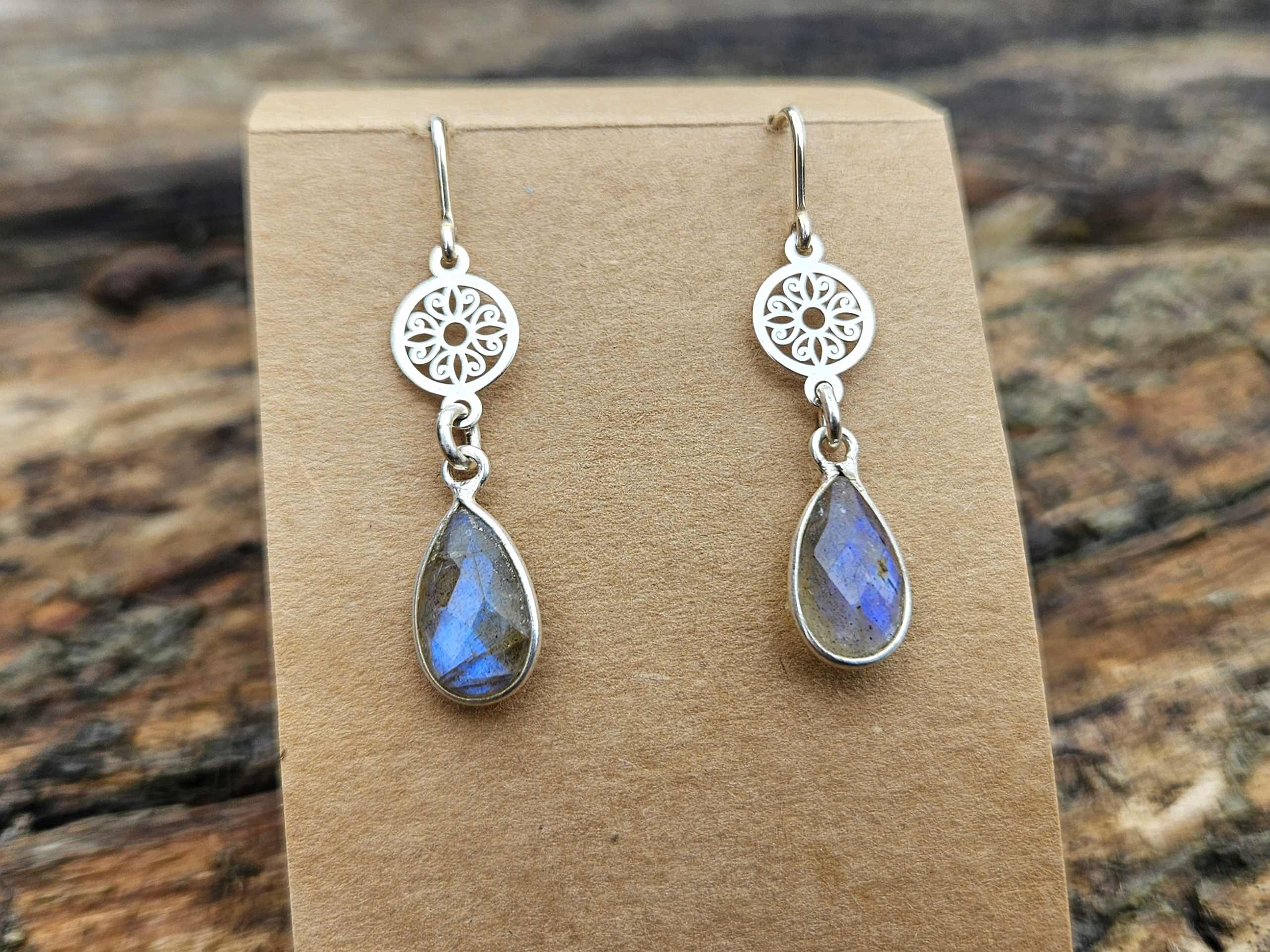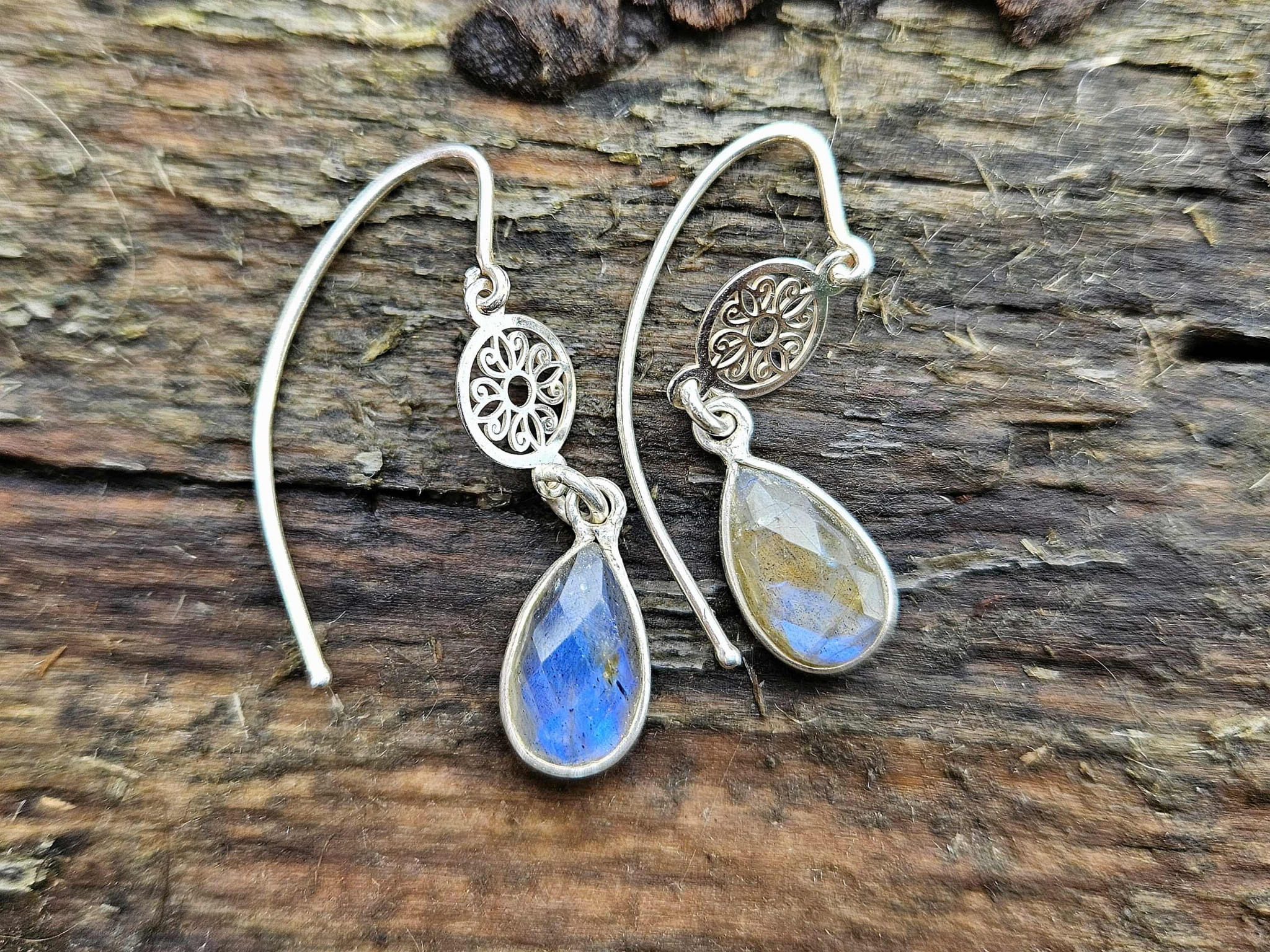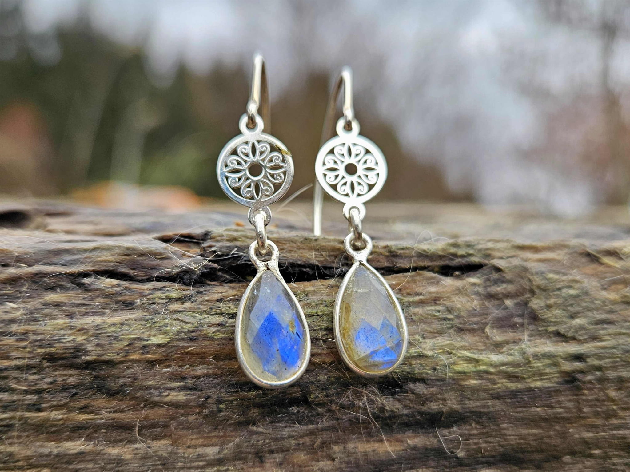 Te piękne kolczyki powstały z połączenia srebra próby 925 oraz naturalnych labradorytów. Wyjątkowy blask labradorytu połączony ze srebrnymi mandalami i biglami tworzy piękną całość.