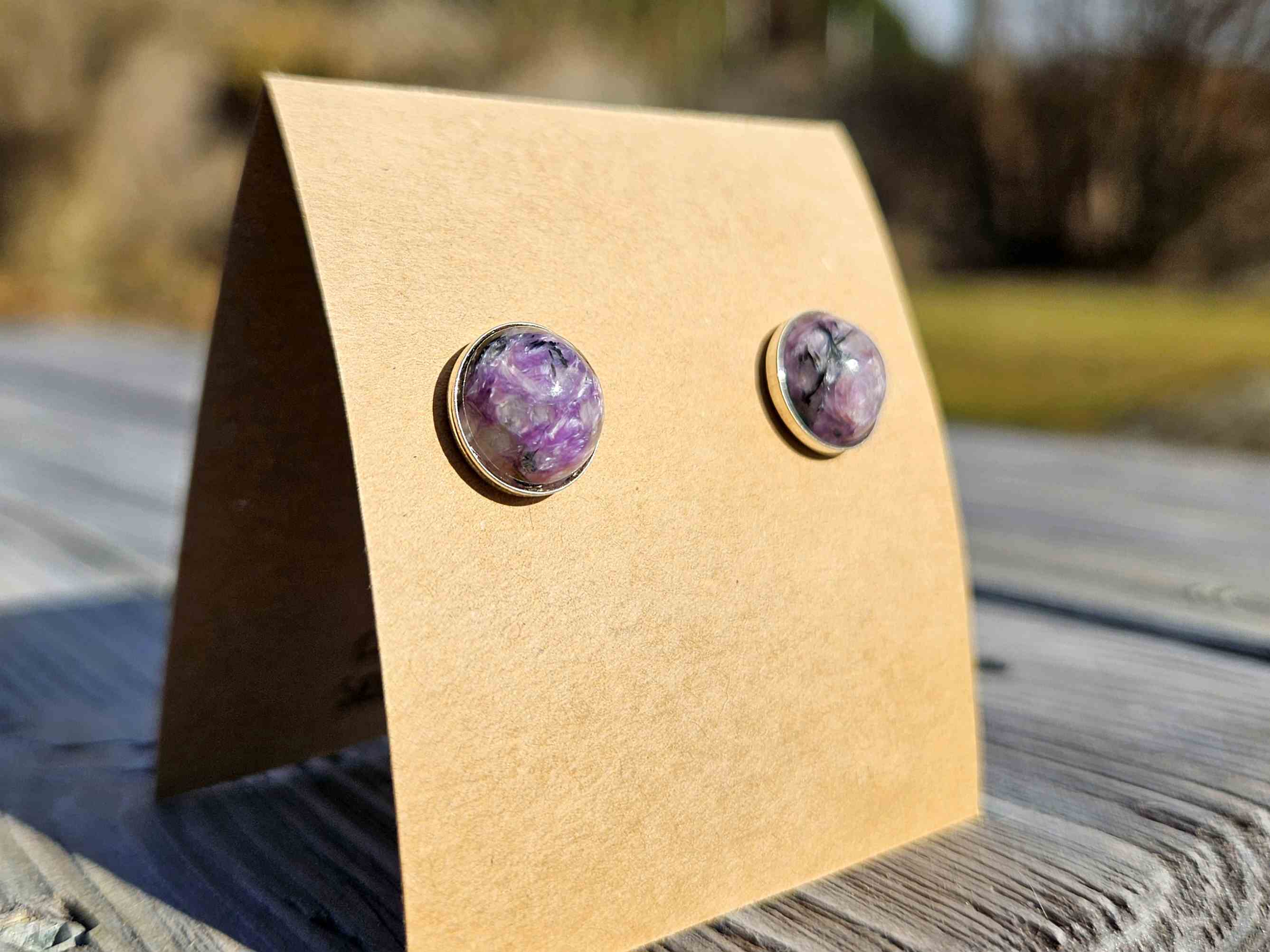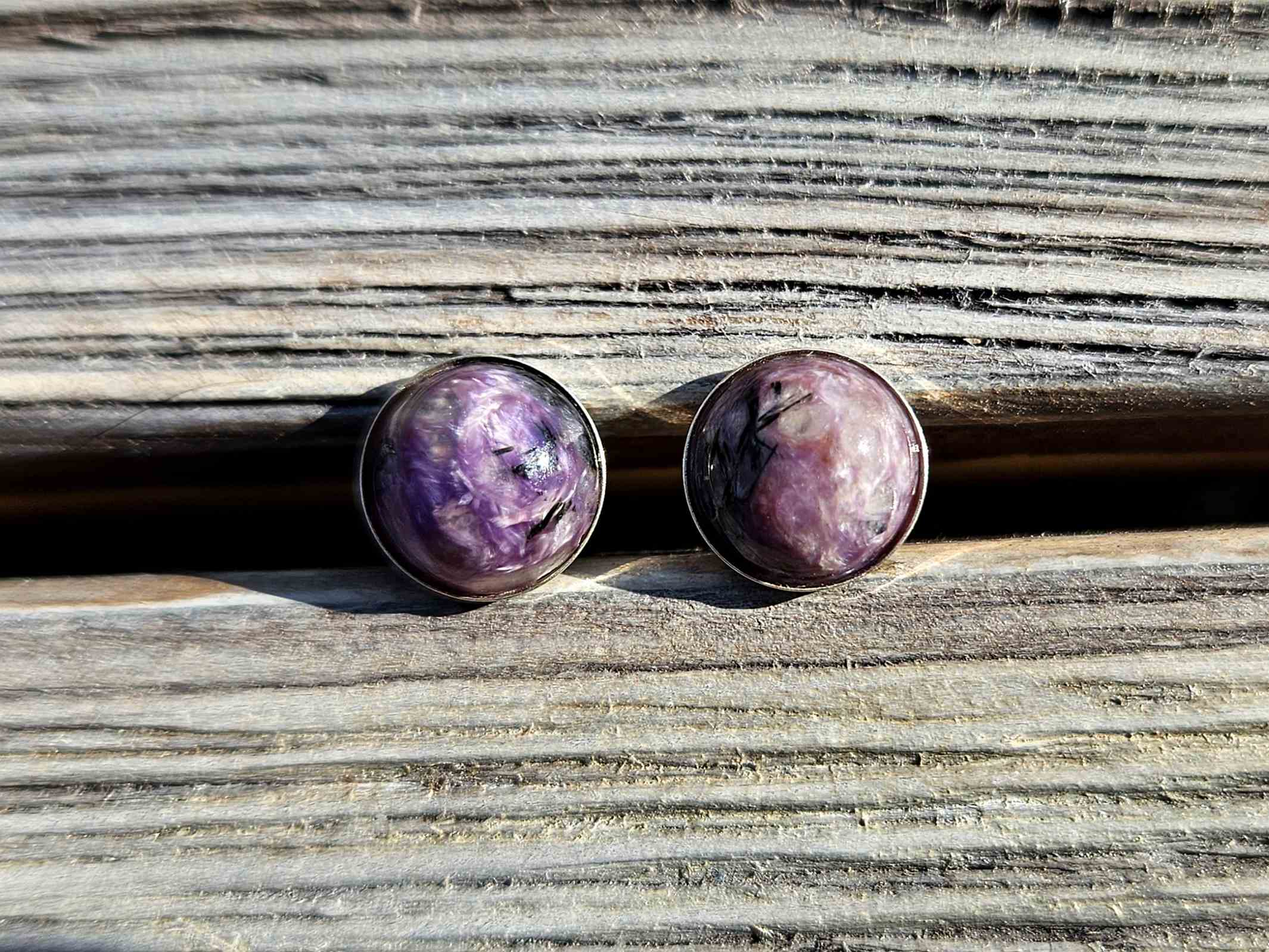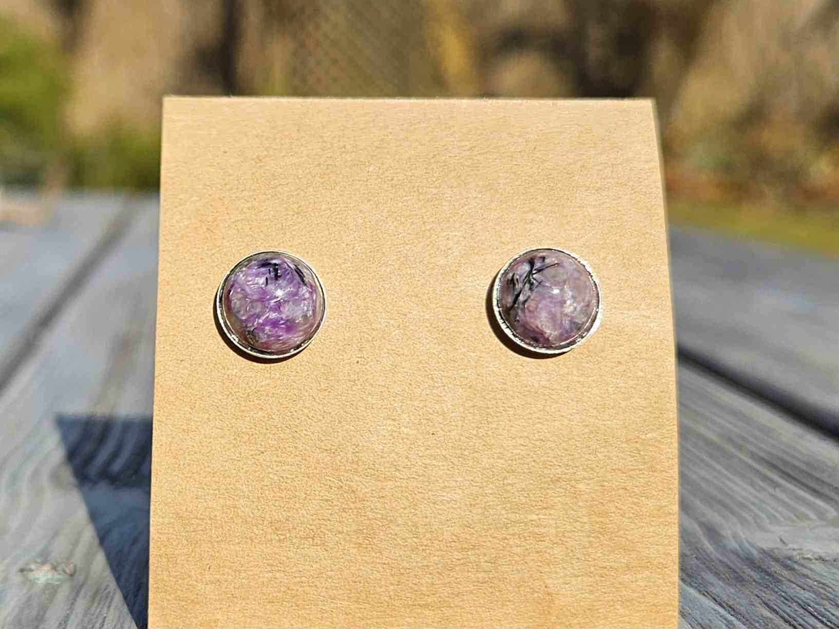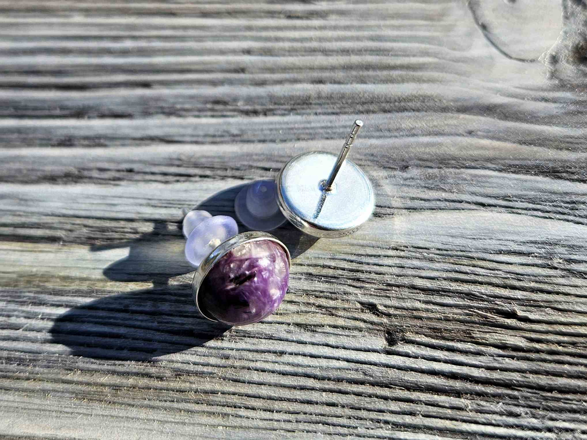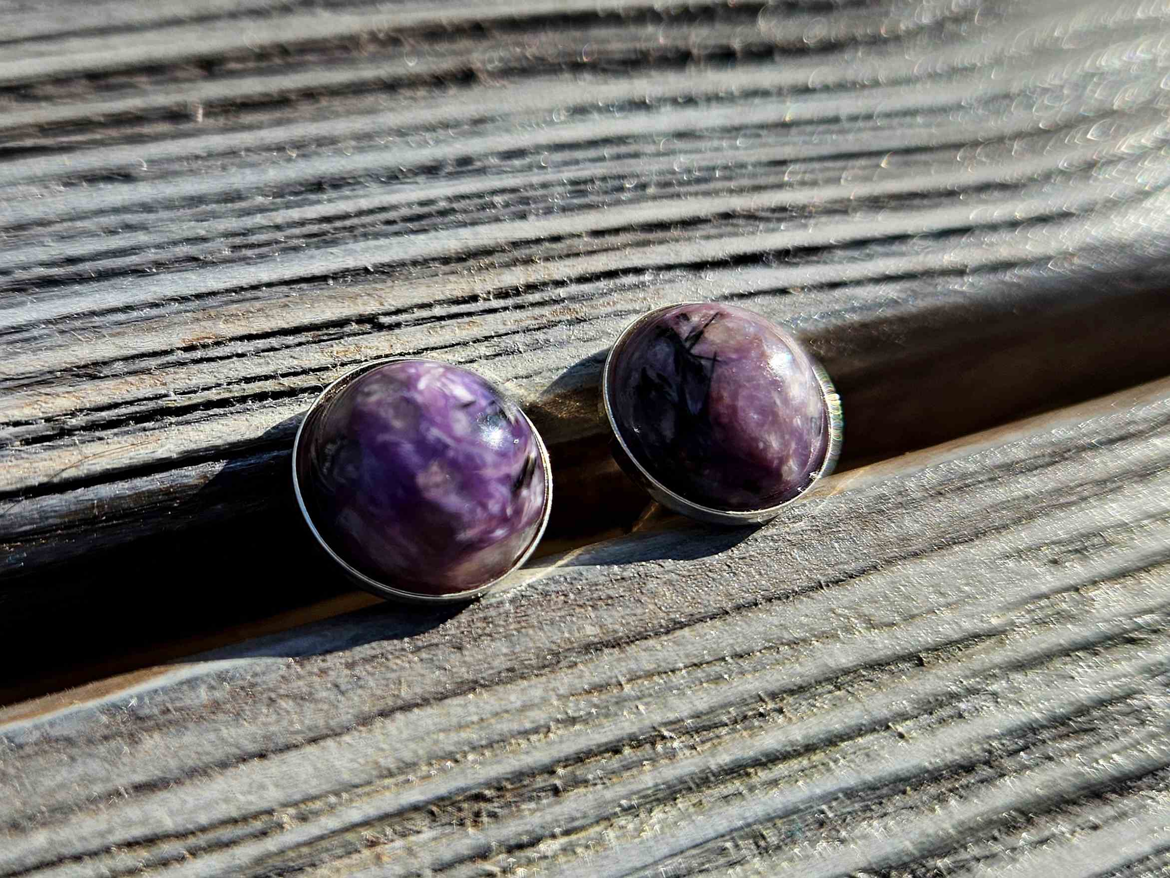 Kolczyki Moc Czaroitu - czaroit, srebro próby 925, 10 mm, rękodzieło