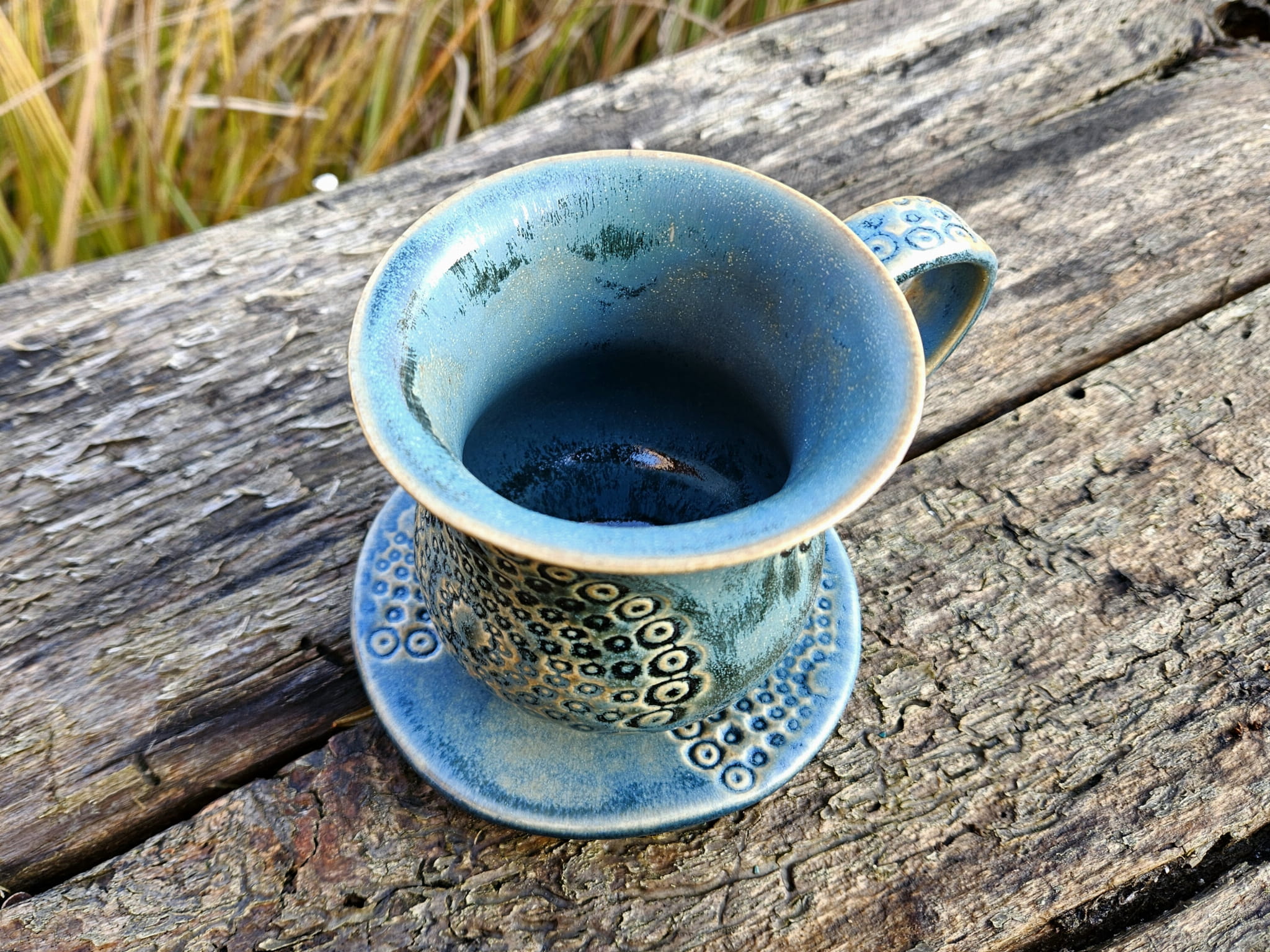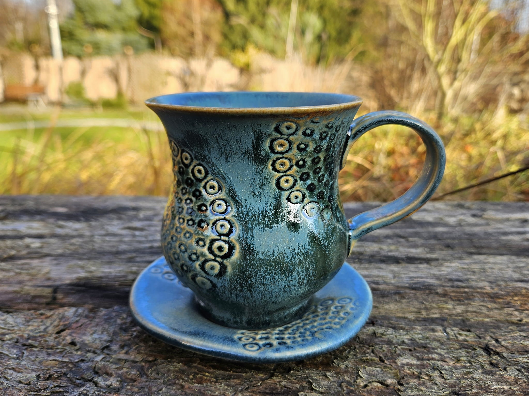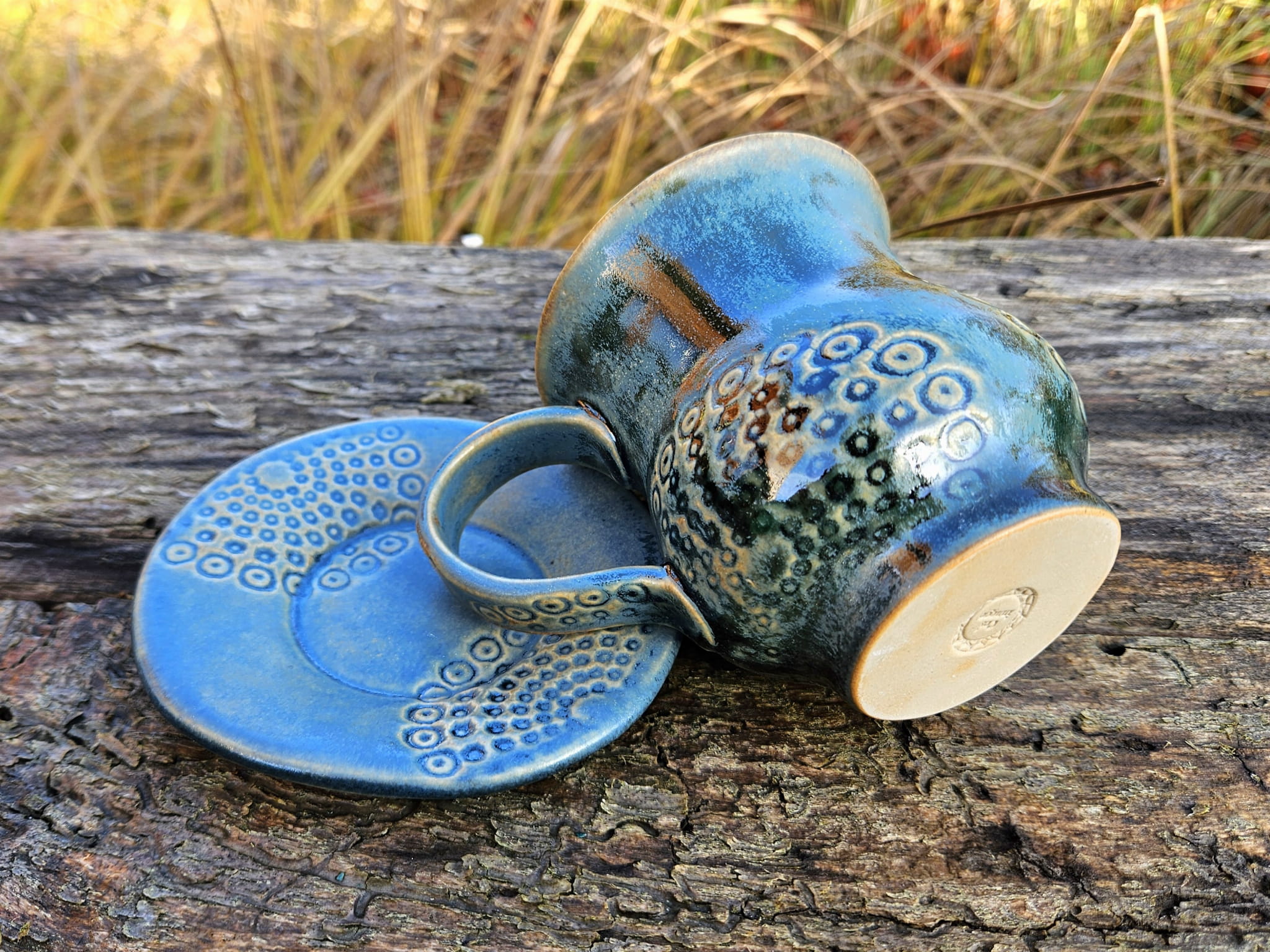 Kubek z podstawką Kosmiczne Kręgi - rękodzieło, 300 ml, granat, błękit