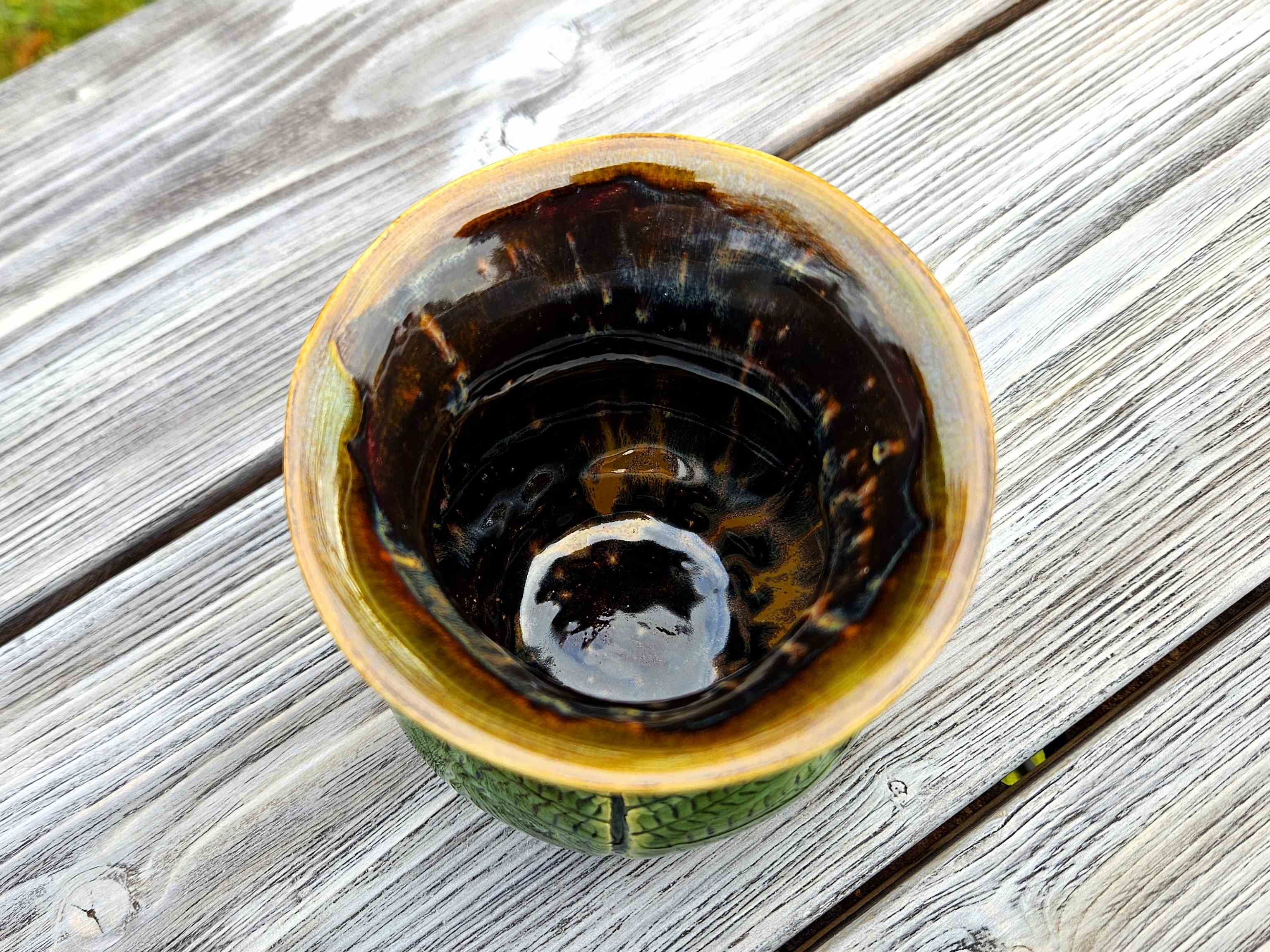 Matero to powstało, by umilać chwile z yerba mate, łącząc tradycję z nowoczesną, rękodzielniczą formą. Głębokie odcienie zieleni i złotego brązu, pięknie łączą się z motywem paproci i finezyjnym kształtem. Pijąc z tego materka można poczuć połączenie z naturą i jej życiodajną mocą.